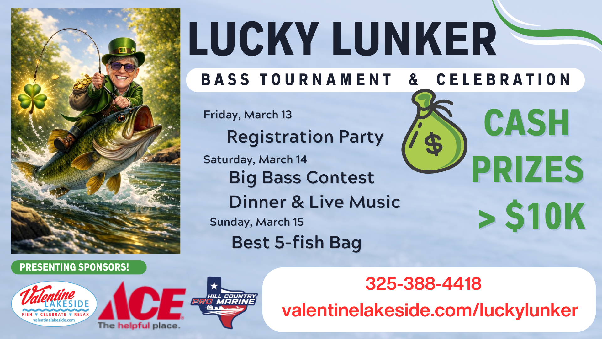 Cash prizes totaling $10K or more! March 14-15, 2026, Valentine Lakeside Saturday: Big Bass contest with weigh-ins every 90 minutes. Sunday: Best 5-fish bag Registration party Friday night Music and dinner Saturday