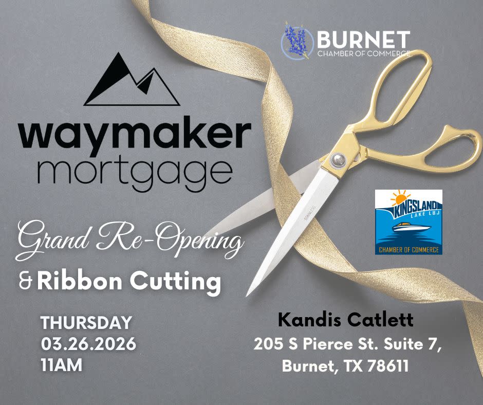 Please join the Kingsland/Lake LBJ Chamber and the Burnet Chamber for a joint ribbon cutting to celebrate the grand re-opening of Kandis Catlett's branch of Waymaker Mortgage. We can't wait to see you there!